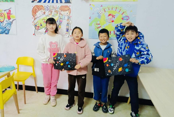 在手工创意课中,志愿者们带领孩子们制作八大行星运行图,和孩子一起探索宇宙奥秘。在志愿者的指导下,小朋友们充分发挥自己的想象力和动手能力,采用搓、揉、捏、切等方法,八大行星运行图跃然纸上。手工课丰富了青少年儿童的生活,既锻炼了动手能力,又提高了专注力和创造力。