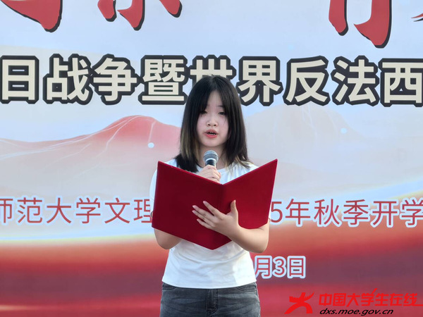 升旗仪式上学生代表陈思雨以“铭记抗战精神,共筑学风长城”为主题作国旗下演讲,倡议加强学风建设,以实际行动在民族复兴的伟大征程中书写青春篇章。