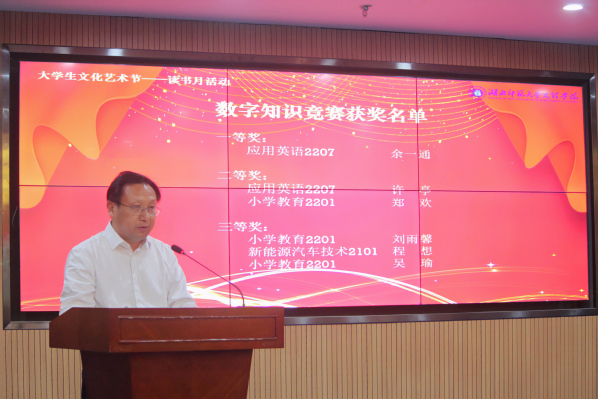 杨邓红宣读了表彰决定。现场对“码上寻书”比赛、“数字知识”竞赛、“阅读正当时,青春向未来”主题征文比赛、“借阅之星”的获奖者进行了颁奖。
