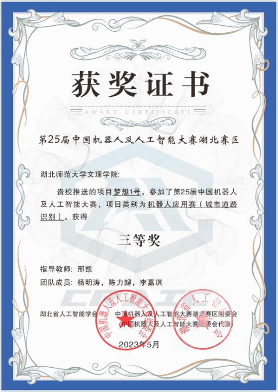 本网讯 (通讯员 邢凯)5月13日-14日,2023年湖北省人工智能大赛暨第二十五届中国机器人及人工智能大赛(湖北赛区)在武汉工程大学举行,爱游戏ayx官网平台_爱游戏(中国)由邢凯老师指导,杨明涛、陈力勰、李嘉琪三名学生组成的团队荣获三等奖。