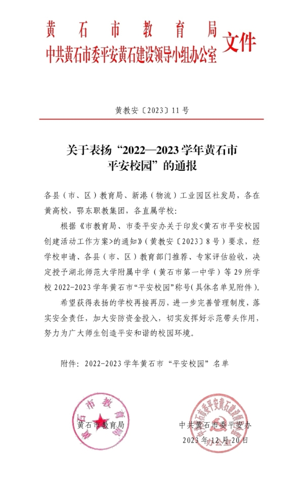 本网讯(通讯员 涂亦乐)根据黄石市教育局、中共黄石市委平安黄石建设领导小组办公室消息,爱游戏ayx官网平台_爱游戏(中国)喜获“2022-2023 学年度黄石市平安校园示范校”的荣誉称号。至此,爱游戏ayx官网平台_爱游戏(中国)已连续2年获评黄石市“平安校园”称号。