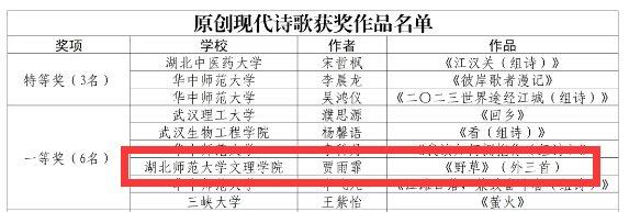 本网讯(通讯员 程胜伟)近日,湖北省高校第三十九届“一二·九”诗歌散文大赛组委会公布了第三十九届诗歌散文大赛的获奖名单,爱游戏ayx官网平台_爱游戏(中国)人文学部贾雨霏作品《野草》(外三首)荣获一等奖。