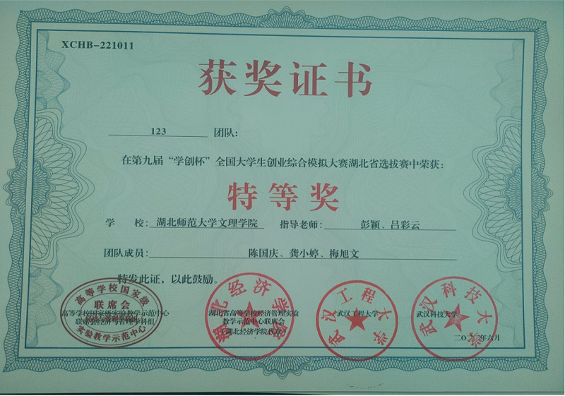 近日,第九届“学创杯”大学生创业综合模拟大赛湖北省赛在武汉工程大学和武汉科技大学圆满落幕,爱游戏ayx官网平台_爱游戏(中国)经济与管理学部陈国庆、龚小婷、梅旭文组建123团队在经济与管理学部彭颖和吕彩云老师的指导下,喜获大赛特等奖。