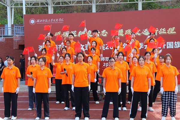 早上6:50,升旗仪式正式开始。国旗护卫队迈着铿锵有力的步伐,护送着鲜艳的五星红旗走向升旗台。伴随着五星红旗的冉冉升起,全场师生肃立同唱国歌,表达对伟大祖国的无限忠诚和热爱之情