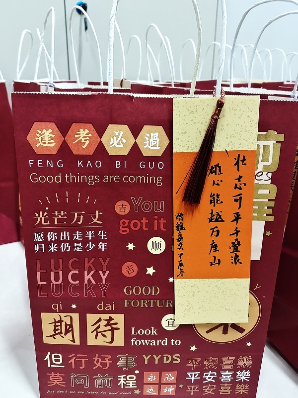 活动现场,学部精心策划,为每位考研学子准备了一份满载祝福的“考研暖心包”:橙子寓意心想事“橙”,一战“橙”硕;薯愿寓意“薯”你最棒,如你所“愿”;士力架寓意“巧克”难题,能量满满;签字笔则寓意“以笔为剑,乘风破浪”。每份礼包上都张贴着老师们亲手书写的考研“祝福贴”,极大地彰显了学部的人文关怀。