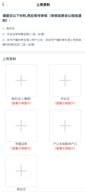 考生登录后根据报名须知中的报考条件上传所需材料并提交审核,提交后请及时关注短信通知中的审核结果。