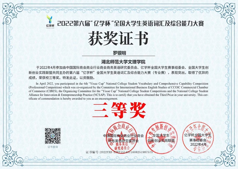 罗银明在第六届“亿学杯”全国大学生英语词汇及综合能力大赛中荣获三等奖