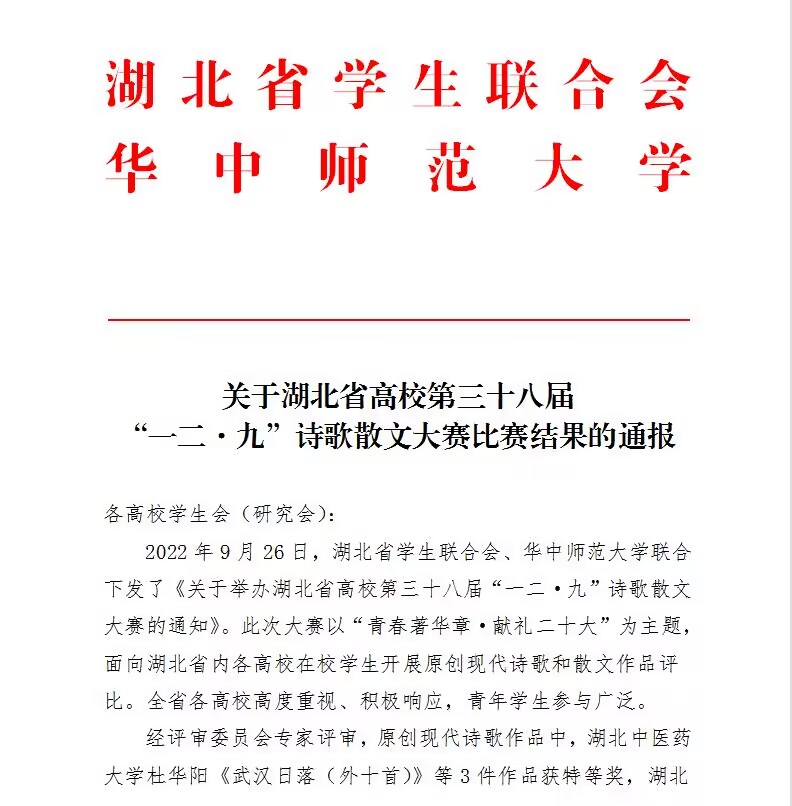 人文学部3名学子在湖北省高校第三十八届“一二.九”诗歌散文大赛中喜获佳绩