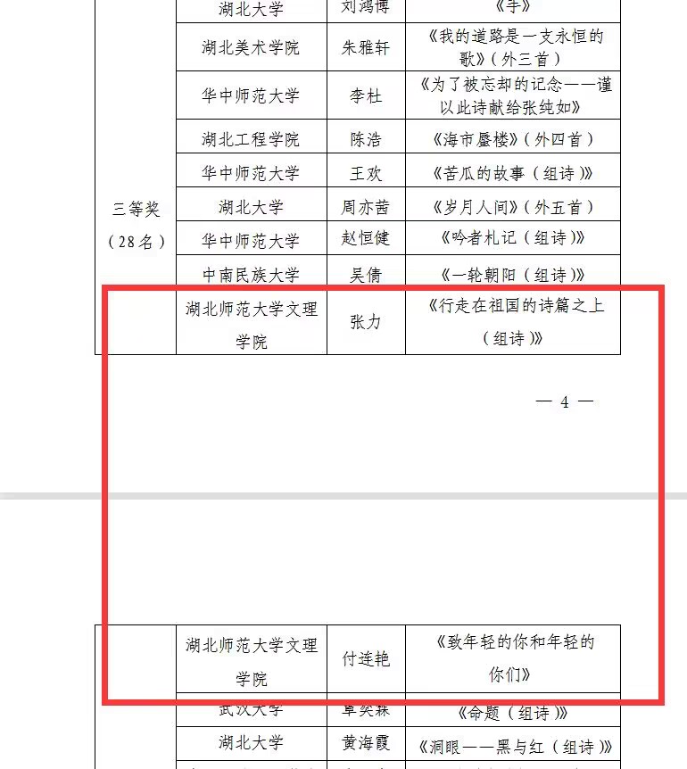 湖北省高校第三十八届“一二.九”诗歌散文大赛以“青春著华章.献礼二十大”为主题,面向湖北省内各高校在校学生开展原创现代诗歌和散文作品评比,全省各高校高度重视、积极响应,青年学生参与广泛,总计收到来自省内56所高校的2030份作品。经评审委员会专家评审,从众多原创现代诗歌作品中分别评选出3名特等奖、6名一等奖、13名二等奖、28名三等奖。
