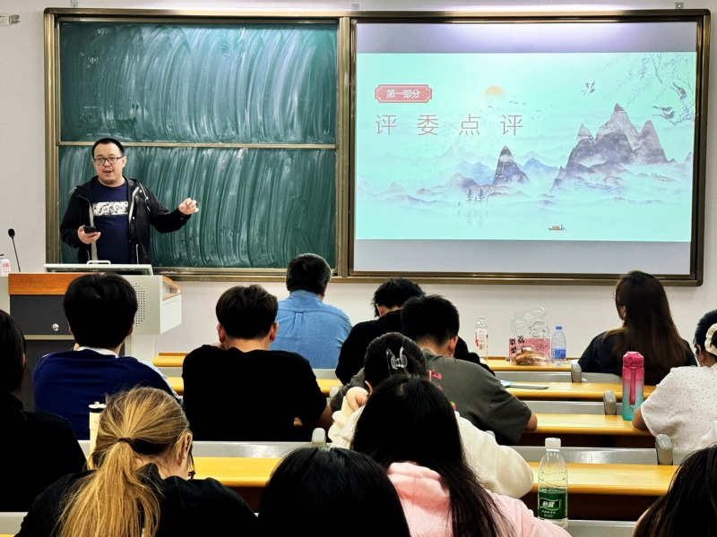 英语专任教师兰铭瑶、邓薇薇、徐唱三位老师担任指导评委,选手们以标准的口语表达、创意的PPT设计,将学情分析、教学目标、活动设计与学科核心素养深度融合,10分钟的展示中,选手们既展现扎实的语言功底,也体现“教—学—评”一体化的设计思维。兰铭瑶、邓薇薇老师在点评中肯定选手“教态自然、环节完整”,同时针对“学情分析同质化”“板书与PPT逻辑衔接不足”等问题提出建议:“英语教学需兼顾工具性与人文性,教学设计应紧扣学生认知规律,让核心素养在真实情境中落地生根。”
