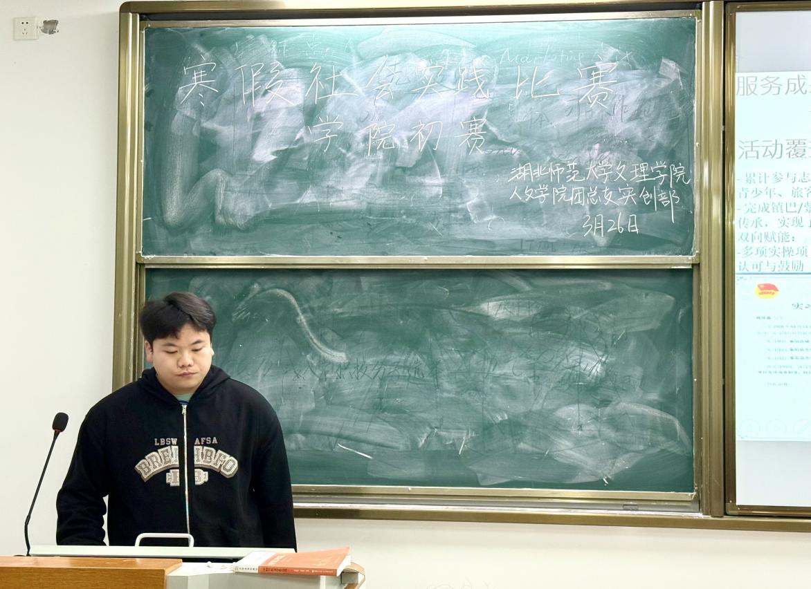为深入学习贯彻习近平新时代中国特色社会主义思想,推动思政教育与社会实践深度融合,人文学院团总支实创部于2026326日晚,在J3-103教室举办“返乡赋能新征程 青春建功新时代”寒假社会实践比赛学院初赛,集中展示了学子“返家乡”实践成果,引导青年扎根基层、服务家乡。