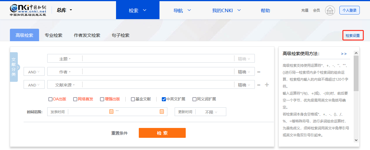 总库提供的检索项有:主题、篇关摘、关键词、篇名、全文、作者、第一作者、通讯作者、作者单位、基金、摘要、小标题、参考文献、分类号、文献来源、DOI。