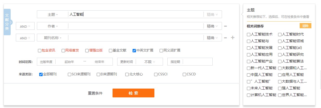(3) 完善检索细节,如:一框式检索、高级检索支持同一检索项内输入*、+、-、''、""、()进行多个检索词的组合运算;完善及新增多项智能引导,包括主题、作者、机构、基金、期刊等检索引导。