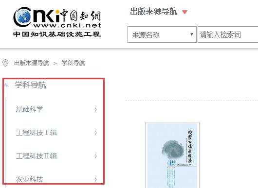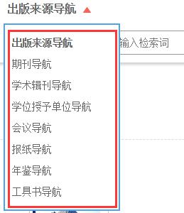 鼠标移入页头“导航”,显示各出版来源导航,点击进入相对应导航页面。