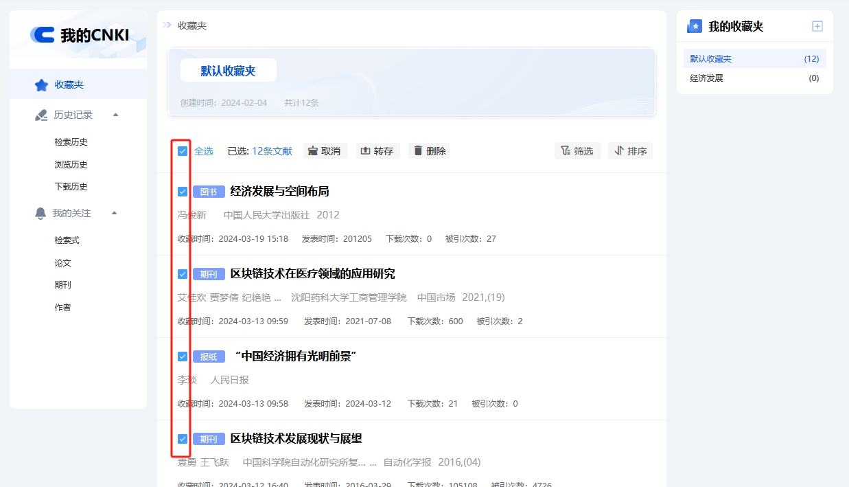 批量管理已收藏文献,可先单击全选或勾选文献前复选框,再点击取消、转存或删除按钮,对已选文献进行批量取消勾选、转存至其他收藏夹或批量取消收藏的操作。如图6.1.3所示。