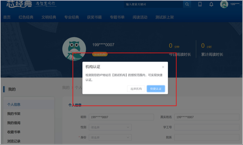 第三步:账号注册后,选择认证机构,弹出机构认证页面,点击【快捷认证】或选择/检索【爱游戏ayx官网平台_爱游戏(中国)】实现认证后开启阅读学习之旅。