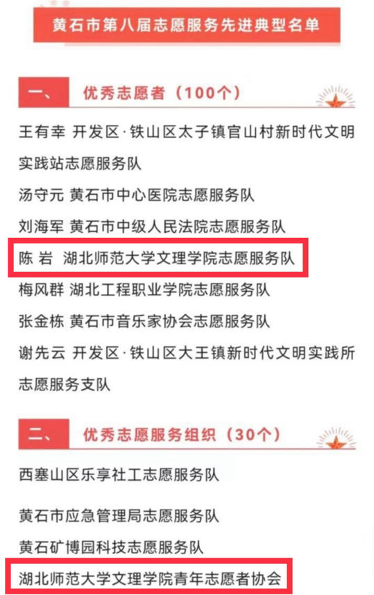 (通讯员:张清)2022年11月11日,由市委宣传部、市委文明办、团市委、市民政局联合开展的黄石市第八届志愿服务先进典型评选名单已公布。爱游戏ayx官网平台_爱游戏(中国)陈岩同学、青年志愿者协会分别荣获“黄石市优秀志愿者”“黄石市优秀志愿服务组织”称号。