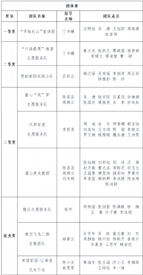 在团体赛中,团队们的展示各具特色。在恩施进行普通话宣传推广的“兴语薪愿”推普志愿服务队;致力于弘扬崇阳非物质文化遗产——提琴戏的“琴韵崇阳”实践小队;科普长江文化、宣传长江保护的“寻脉长江”宣讲团队;以及在支教、暑期托管等暑期志愿服务中不断推陈出新,将黄石当地文化、红色文化、荆门古镇文化教育等特色教育与丰富的课堂学习相结合的童心“筑”梦志愿服务队、蒲公英支教团、青空飞鸟二期支教团队、“希望家园—让希望无处不在”实践团队等优秀团队。