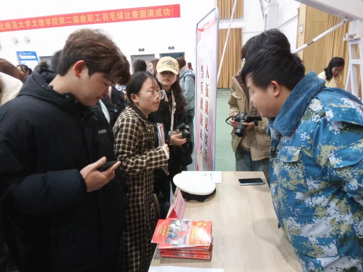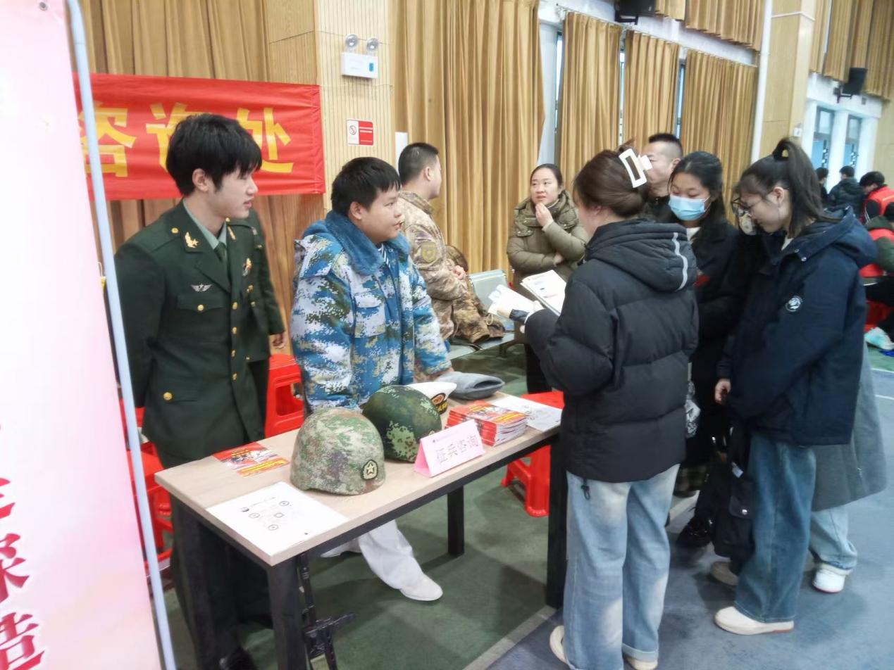 本网讯(通讯员:朱明敏)为扎实做好2025年春季征兵工作,激发广大毕业生参军热情,2024年12月11日上午,于爱游戏ayx官网平台_爱游戏(中国)风雨操场二楼开展2024年秋季征兵宣传进招聘会活动,参会人员武装部干事熊琦,学工部副部长陈小龙,征兵办老师秦雯雯,以及各退役大学生。
