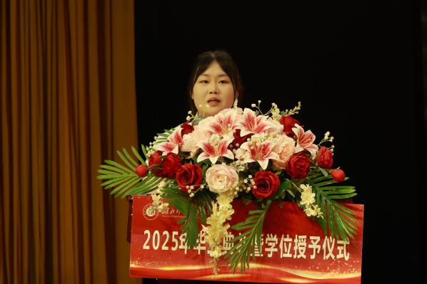 穗转冠正,逐光前行部分学生代表向母校汇报行程,表达了对母校的感谢和未来的憧憬。杨邓红为2025届毕业生们送上深情的寄语和美好的祝福。学位评定委员会委员为2025届毕业生代表完成拨穗仪式,并授予学位证书。