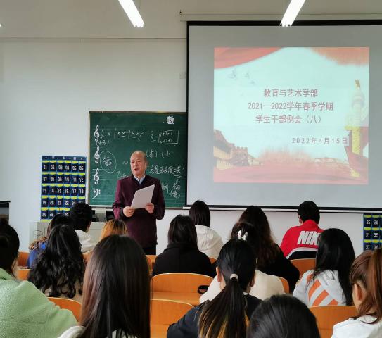 2022415日中午1200,教育与艺术学部按照惯例在实验楼一栋403多媒体教室组织召开学生干部工作例会。出席本次会议的人员有辅导员老师、团学会干部及各专业班级班长。会议由党总支书记李先华主持。