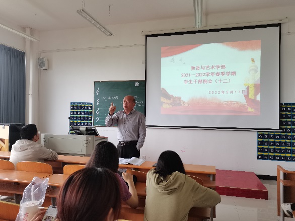 2022513日中午12:00,教育与艺术学部按惯例在实验楼1-403多媒体教室组织召开学生干部工作例会。参会人员有辅导员老师、团学会干部及各专业班级负责人。会议由总支书记李先华主持。