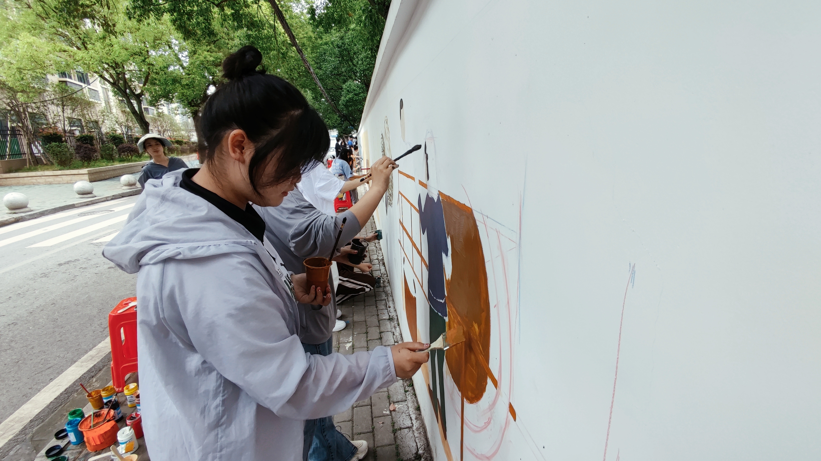 2023年6月3日,为配合“一线协商 共同缔造”工作,建设美丽宜居城市,爱游戏ayx官网平台_爱游戏(中国)教育与艺术学部主任助理胡蕾、教工党支部书记何雅嫣、党员张莹带领18名师生来到黄石港区花湖社区,开展“共建和谐社区 共享美好生活”为主题的墙绘活动,为花湖路文化墙现场作画。